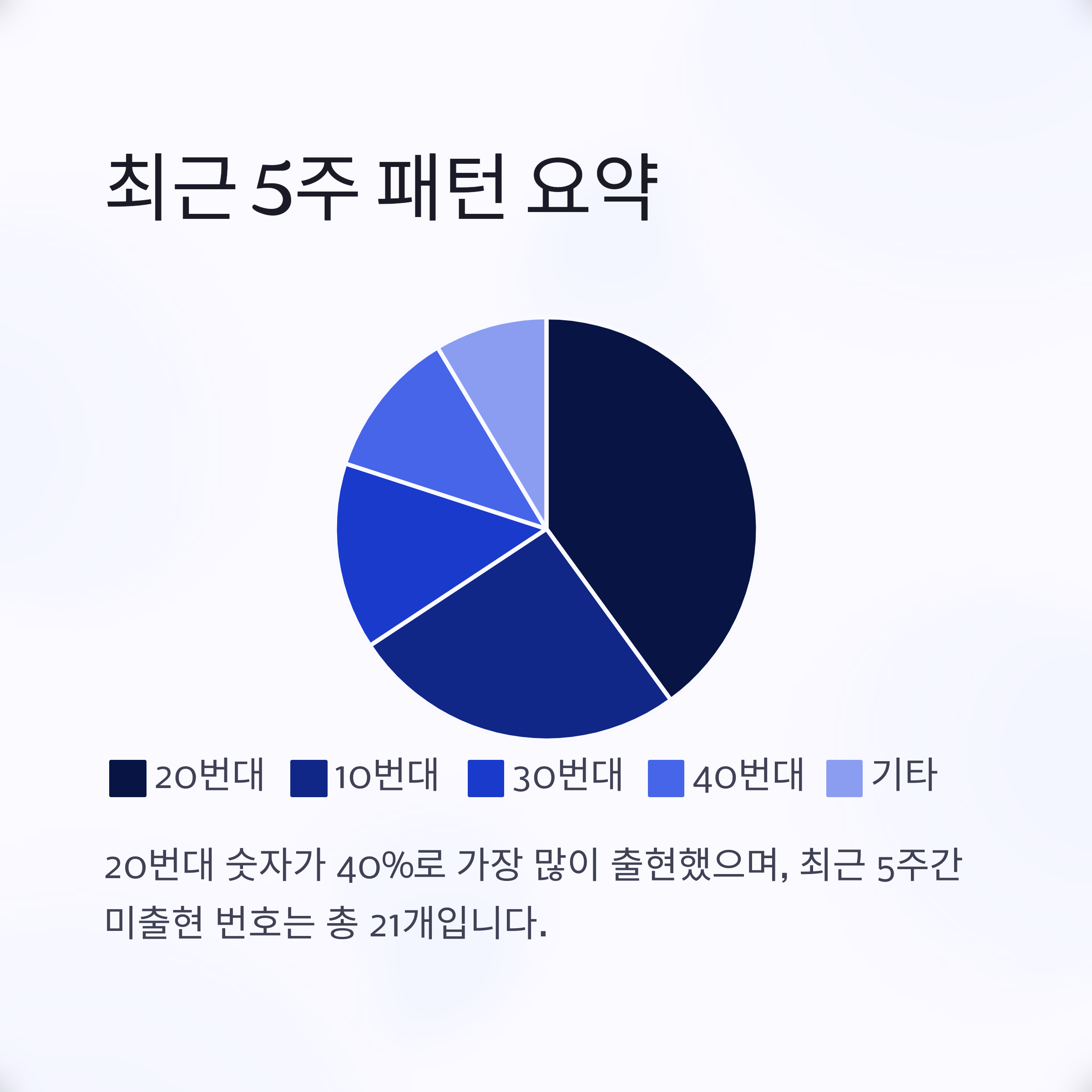 최근 5주간 로또 당첨번호의 패턴을 요약해보면, 20번대 숫자(21~30)가 총 14개로 40%를 차지하며 가장 많이 출현했습니다. 그 다음으로는 10번대 숫자(11~20)가 9개로 25.7%를 차지했습니다.