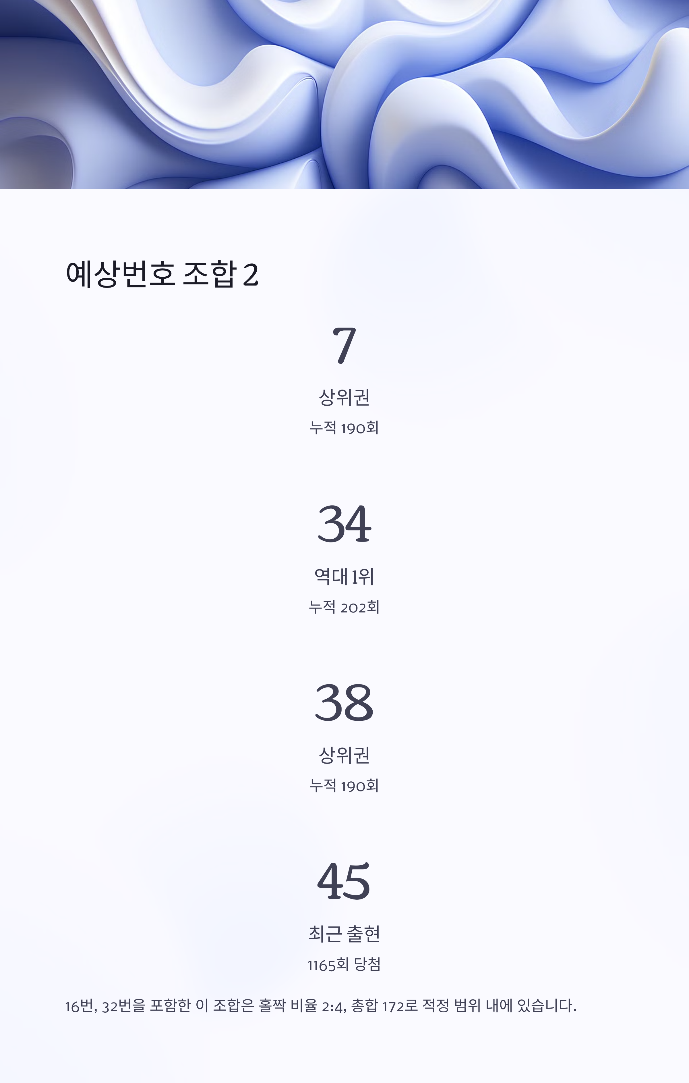 두 번째 예상번호 조합은 7, 16, 32, 34, 38, 45입니다. 이 조합은 역대 누적 당첨횟수가 높은 번호들을 중심으로 구성했습니다. 34번은 역대 최다 당첨번호(202회)이며, 38번은 상위권(190회)에 속합니다.