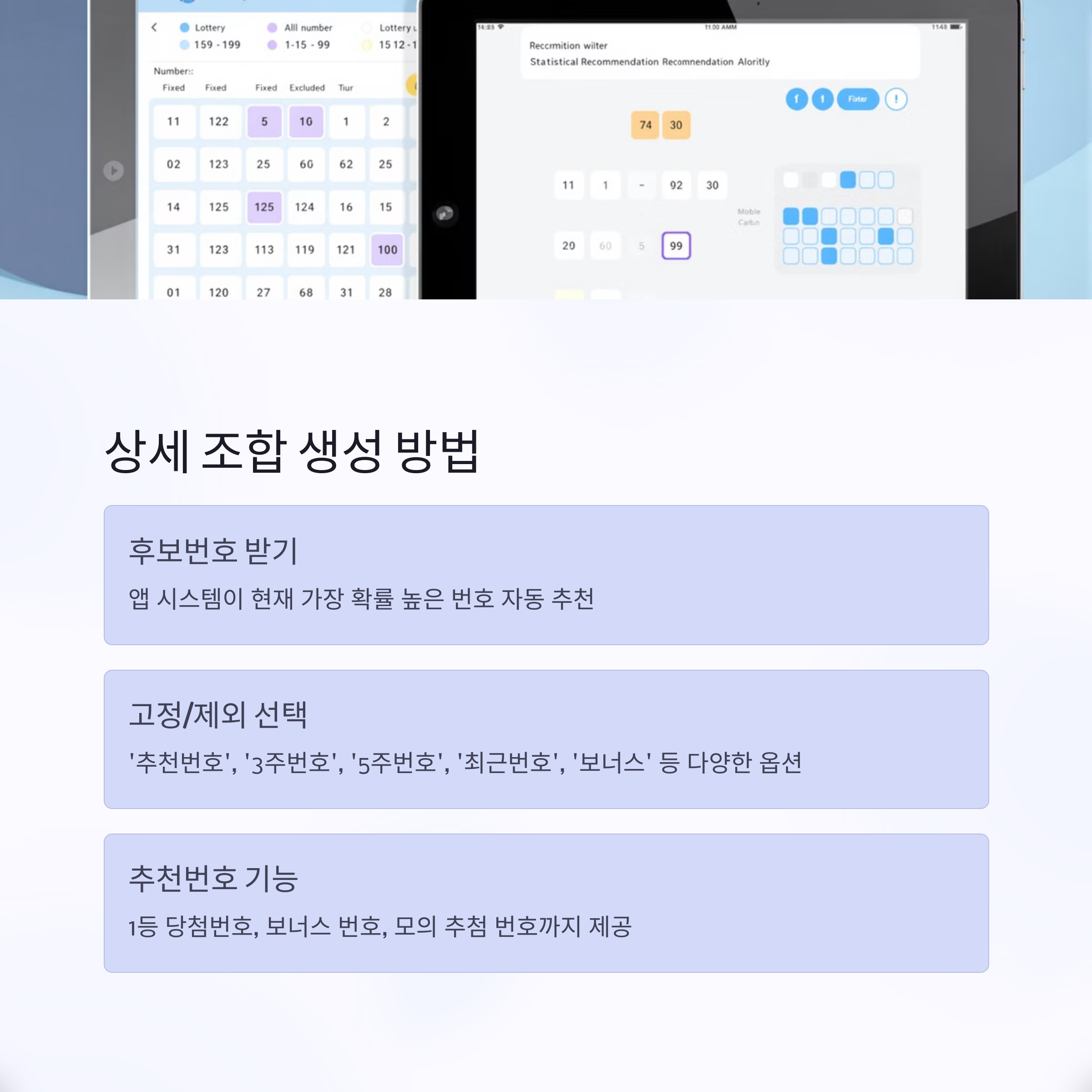 로또645 앱의 '상세 조합 생성' 기능은 더 전문적인 방식으로 로또 예상번호를 생성할 수 있는 방법입니다. 이 화면에서는 고정수와 제외수를 설정하고, 다양한 추천 기능을 활용할 수 있습니다.