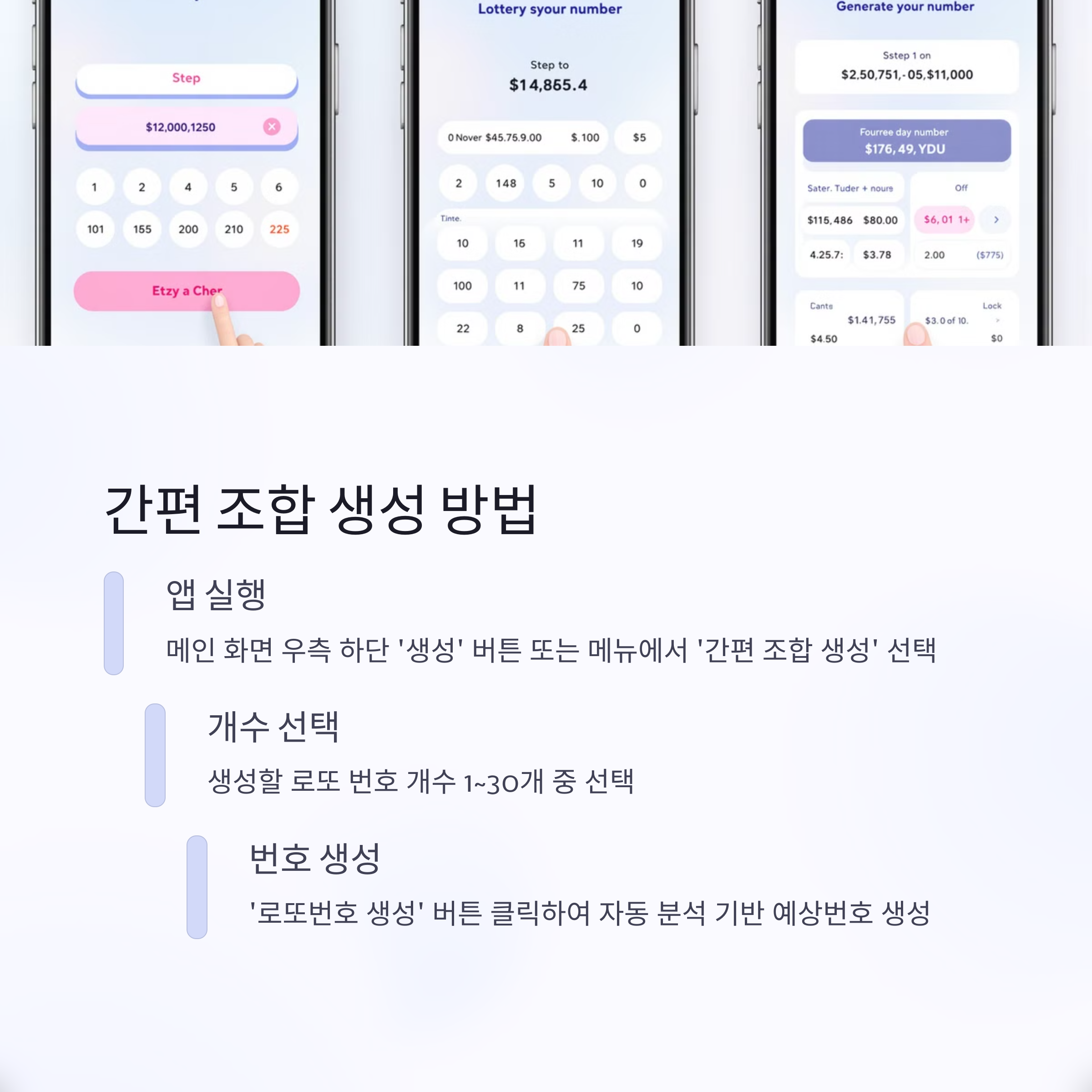 간편 조합 생성 화면에서는 생성할 로또 번호의 개수를 1개에서 최대 30개까지 선택할 수 있습니다. '로또번호 생성' 버튼을 누르면 앱이 자동으로 최근 5주간 출현번호와 미출현번호의 당첨비율을 분석하여 예상번호를 생성합니다.