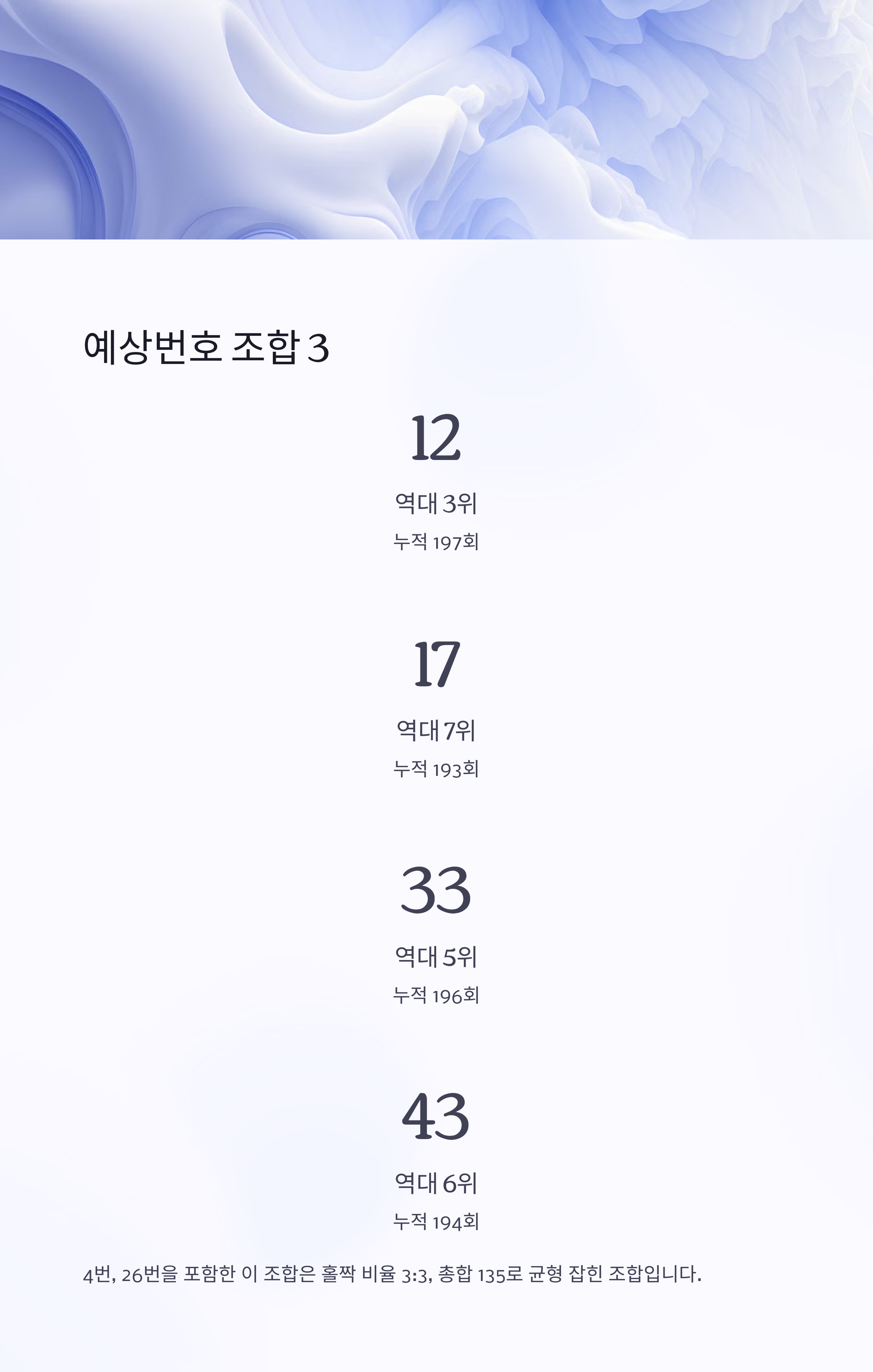 세 번째 예상번호 조합은 4, 12, 17, 26, 33, 43입니다. 이 조합은 최근 출현하지 않은 번호들 중에서 역대 당첨 빈도가 높은 번호들을 선택했습니다. 12번은 역대 3위(197회), 33번은 5위(196회), 43번은 6위(194회)의 당첨 횟수를 기록했습니다.